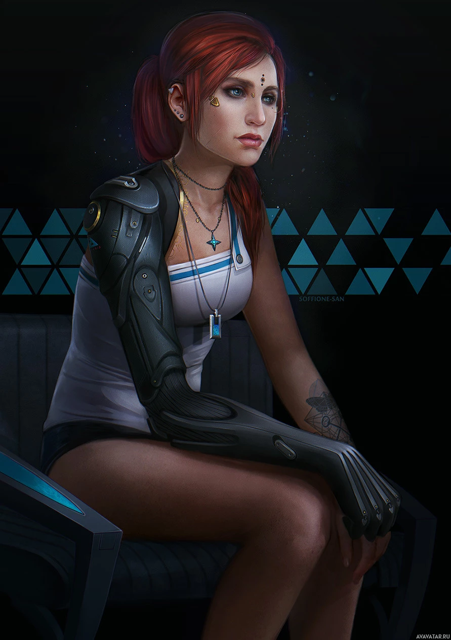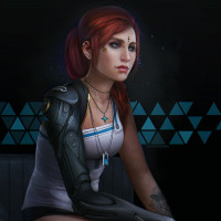 a female character with red hair, wearing what appears to be futuristic or cyberpunk-style clothing and accessories. She has robotic enhancements visible on one arm, suggesting a theme of