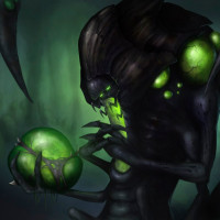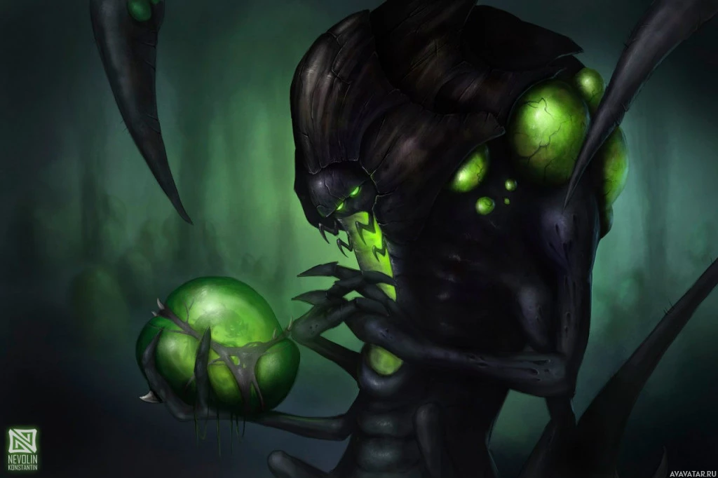 a fantasy monster. It has a dark, menacing appearance with glowing green eyes and sharp teeth, which suggests it could be an evil or dangerous entity in this