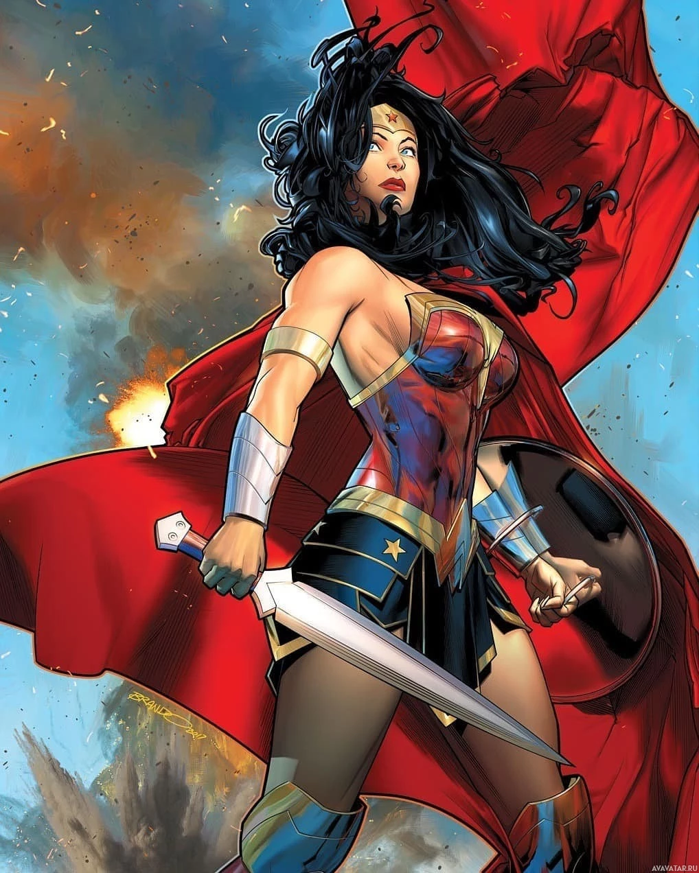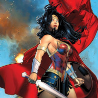 Wonder Woman. She is depicted wearing her traditional costume, which includes a red and blue bodysuit with the emblem of her home island Themyscira on her chest, a tiara, bracelets, and