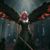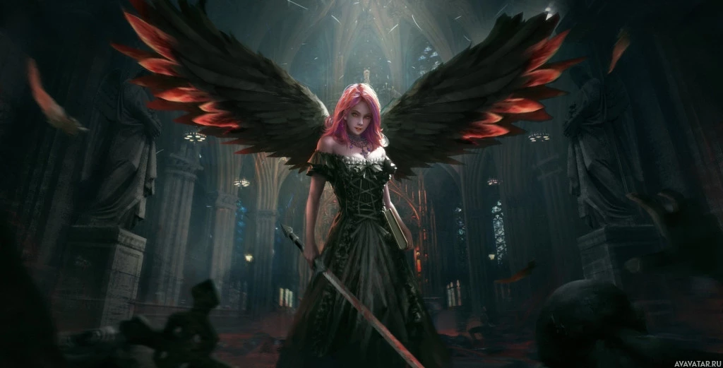 pink hair and is depicted with wings, suggesting an angelic or divine nature. She is holding a sword, which is often associated with warriors or guardians in