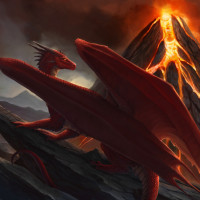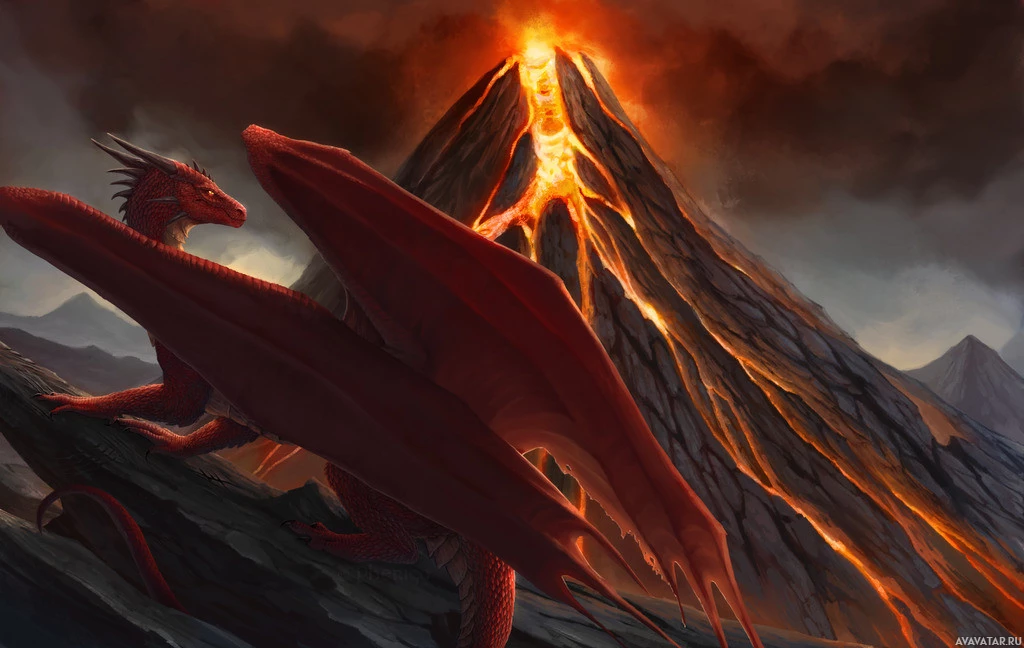 a fantastical scene featuring two dragons. One of the dragons is standing upright and appears to be in conversation with another dragon, which has its wings folded as if it's sitting or reclining. They are situated near a volcanic eruption, with lava flowing from an opening in