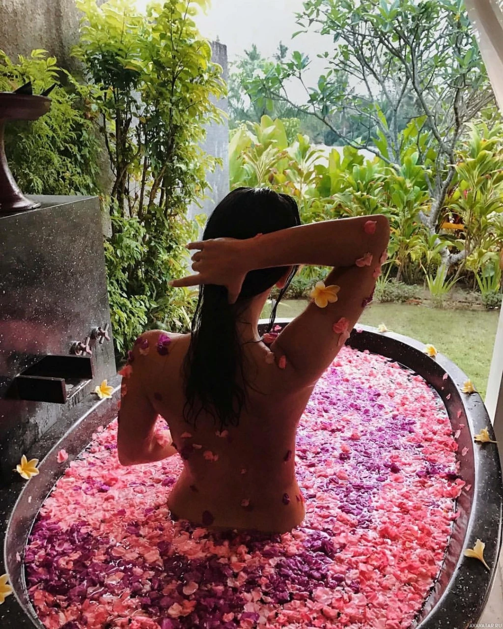 outdoor setting, and greenery can be seen through the window. This scene might also indicate some form of spa treatment or a special bathing ritual where