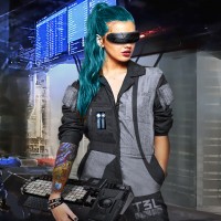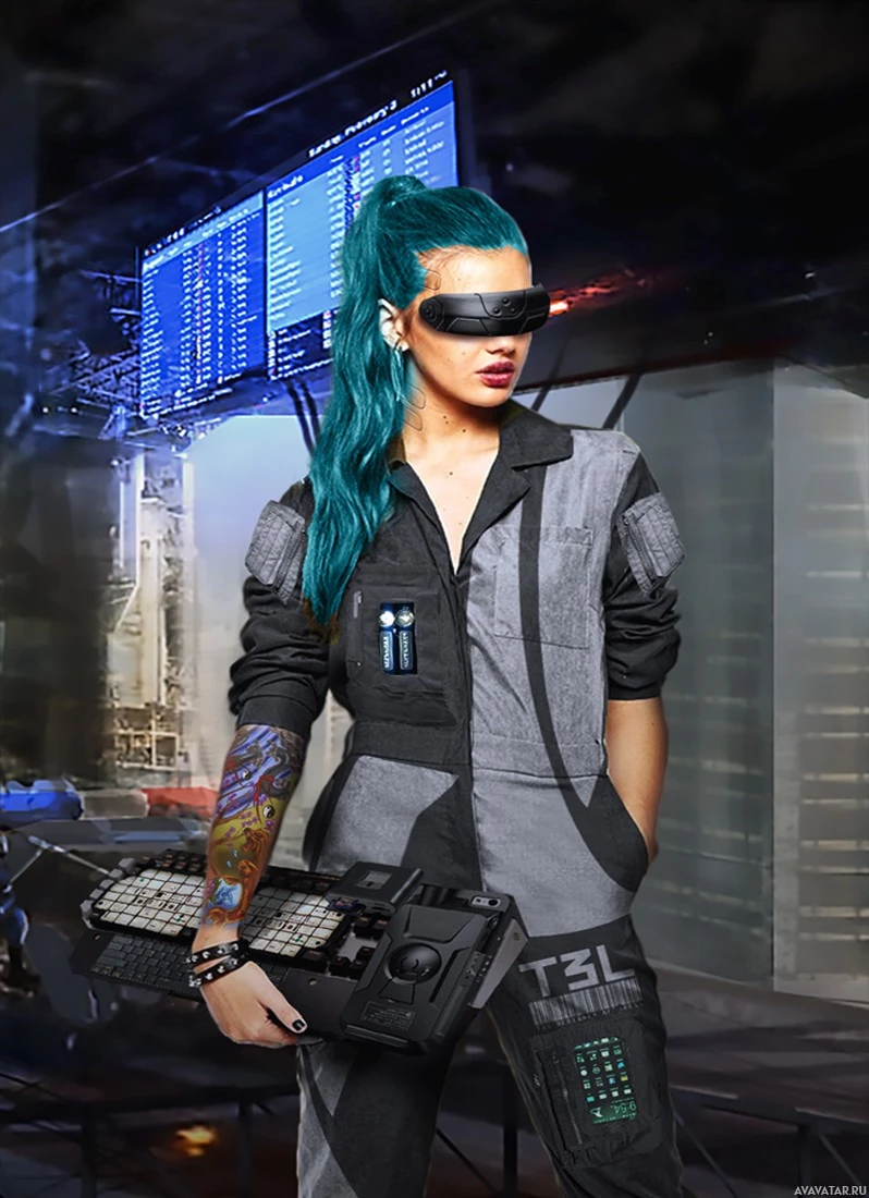 turquoise hair and she appears to be wearing a futuristic-looking outfit that could be interpreted as a space or tech suit. She also has a tattoo on her right arm. The setting suggests a high-