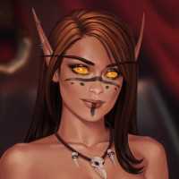 pointed ears and what appears to be magical or mystical eyes, possibly red in color, which could suggest she has some sort of enchantment or otherworldly powers. Her attire is reminiscent of traditional or fantasy-style clothing, possibly a bikini top with tribal designs, indicating that she might be a character from