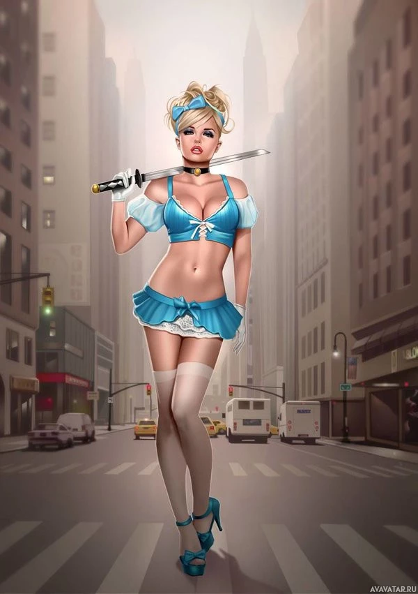 an urban setting that resembles New York City with skyscrapers and street signs. The character is blonde, wearing blue lingerie that suggests a seductive or fantasy-inspired theme rather than traditional Belle attire from