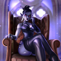a drow from the Dungeons & Dragons universe. This character has dark skin, pointed ears, and is wearing a tight-fitting outfit with a high collar, which is characteristic of drow attire in many