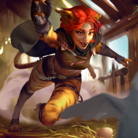 a fantasy setting. The character has animal features, suggesting they may have some magical or mythical nature. They are holding what looks like