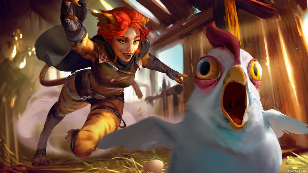 an ancient book, perhaps indicating their role as a scholar or wizard. In front of this character is a chicken that seems to be squawking or reacting with surprise. The setting appears to be outdoors with some