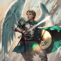 The image shows a fantasy character that resembles an angel or a warrior with wings, wielding a sword. She is depicted wearing armor and a cloak, suggesting she might be a guardian or a protector in the context of this fantasy setting.