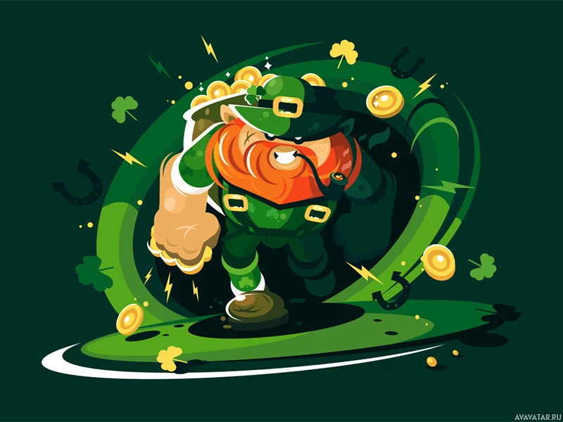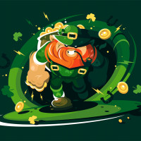 gold trim. The leprechaun appears to be running or jumping, as indicated by his
