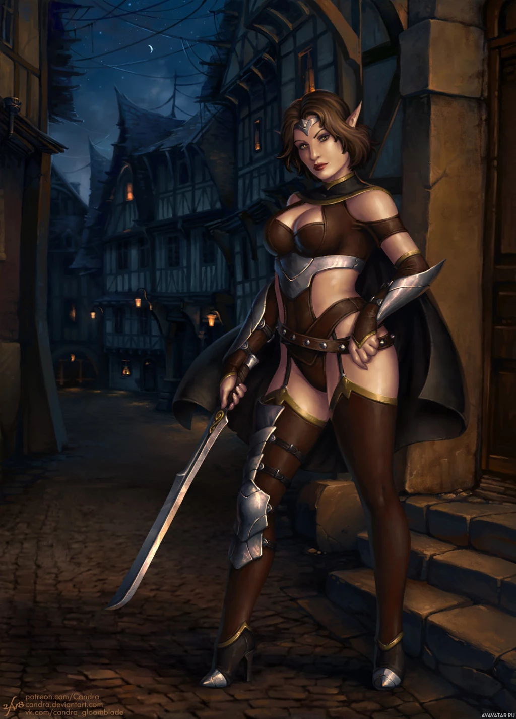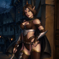 a female character portrayed in a fantasy setting, reminiscent of a medieval or renaissance town. She is dressed in armor with breastplate and thigh guards, carrying a sword at her side. Her attire includes elements that suggest elven inspiration, such as pointed ears, which are commonly associated with elves in