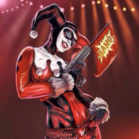 iconic costume: tight red and black bodysuit with face paint that includes white skin, black around the eyes, red accents around the lips, and black on the eyeliner, all worn by actress Margot Robbie in the 2016 film "Suicide Squad." In the image, Harley is holding a gun and has a flag with the Joker's face on it. The background suggests that she might be at a performance or an event, possibly associated with her character's love for theater and chaos.