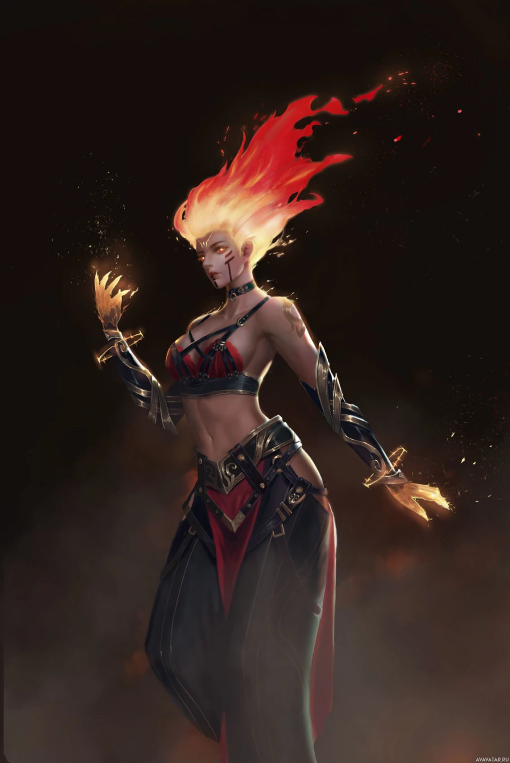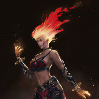 fiery hair, suggesting she might have some connection to fire or magic. She is wearing armor and a helmet that could indicate she is a warrior or fighter of some sort. The character's pose and the dynamic background elements give