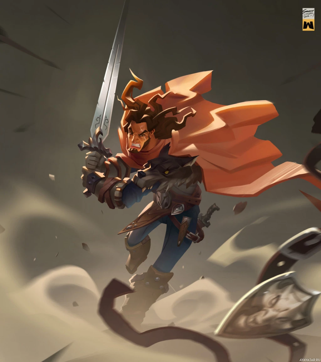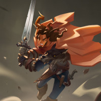 an action pose, as if they are either attacking or defending themselves. They are dressed in what appears to be armor with blue accents and a cape, suggesting