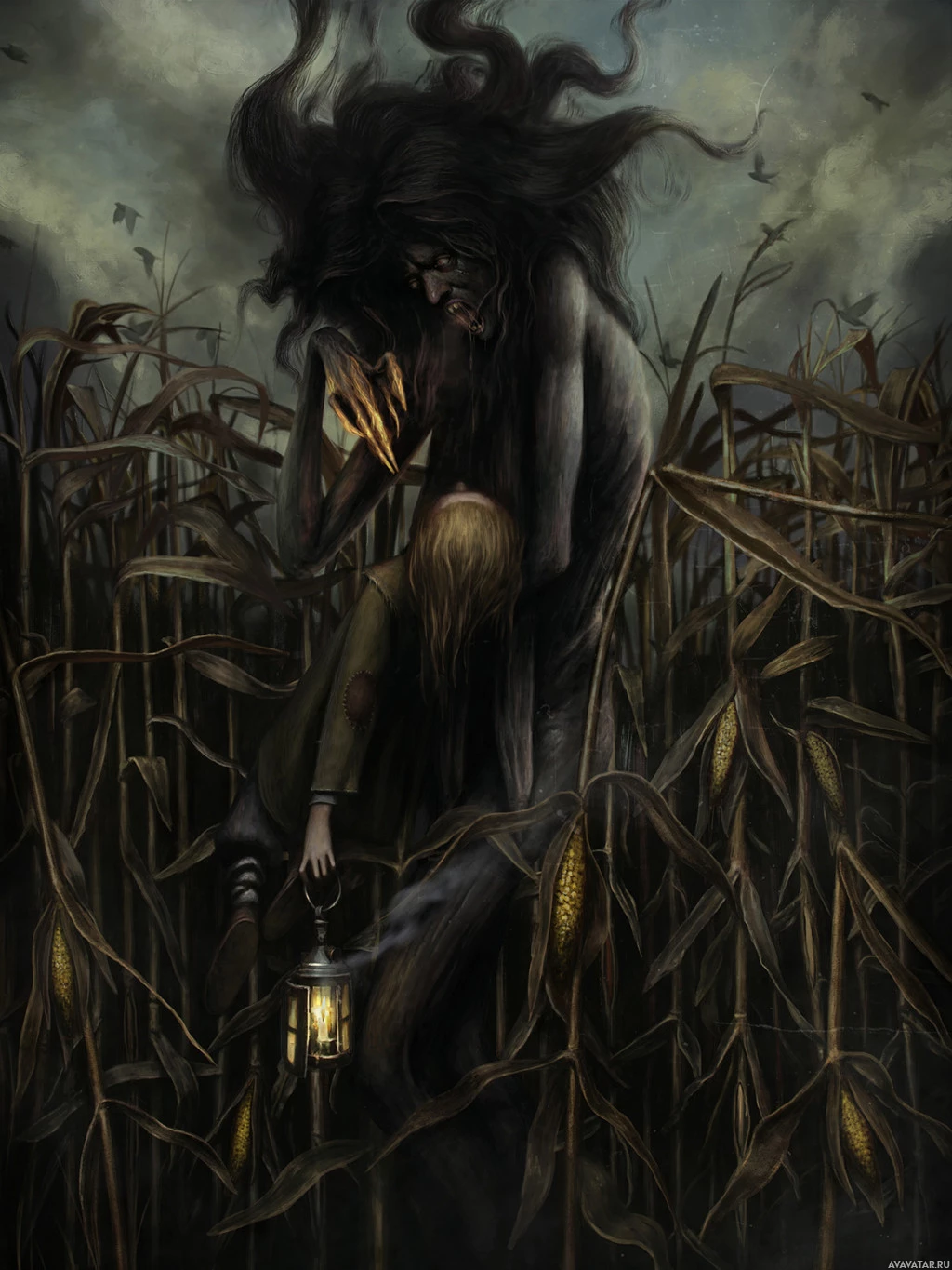 black hair and is holding onto what seems to be a young child, possibly dragging them into a cornfield at night. The sky is dark with clouds, suggesting