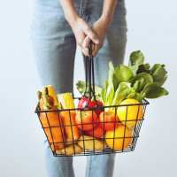 fresh fruits and vegetables. In the basket, you can see items such as carrots, lettuce, broccoli, and possibly other produce like tomatoes or