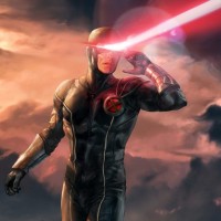 a superhero suit and has a visor over his eyes. The character's pose suggests he might be looking off into the distance, possibly observing something beyond our view. The overall atmosphere of the picture is quite intense and seems to set up for some sort of adventure or action sequence.