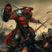 a fantasy scene with a creature that appears to be a mutant dragon warrior. It is holding up one of its hands in what looks like