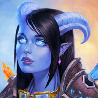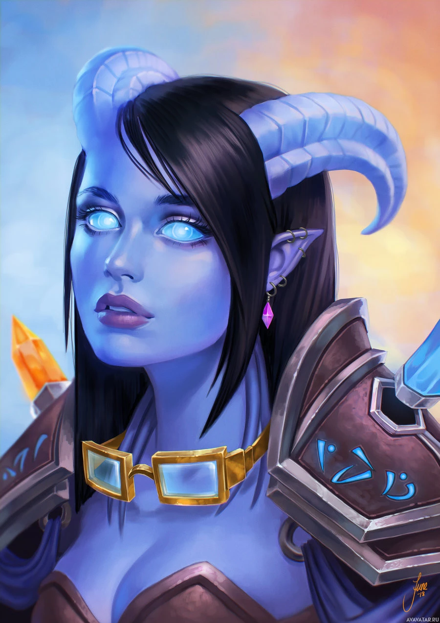 female character with fantasy-themed features. She has blue skin, pointed ears, and what appears to be horns or antlers on her head, which are characteristic of draenei from
