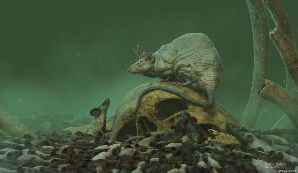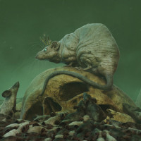 a surreal scene with two animals in an underwater setting. On the left side, there is what appears to be a large rat or rodent with a crown-like structure on its head, standing on rocks. To the right of this creature is another animal that resembles a dog. The water around them has a greenish hue and they seem to be in