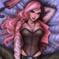 an animated character, a girl with pink hair lying on her back. She is wearing