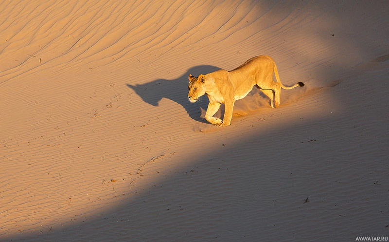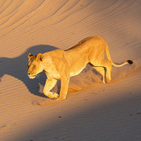 early morning or late afternoon, as indicated by the warm lighting and shadows cast on the sand. The lion's movement suggests it might be exploring its surroundings or searching for prey. This scene captures the majesty of the animal in