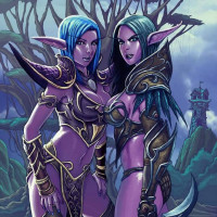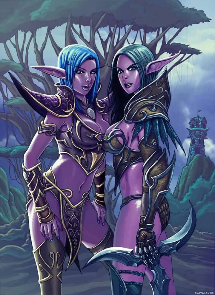 blue hair, which is common for drow in fantasy artwork. Both characters are wearing armor and weapons, suggesting they may be warriors or adventurers. The setting seems to be