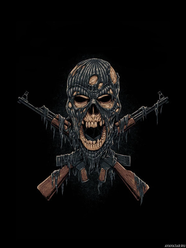 a dark background. Within the eye sockets and mouth of the skull are crossed rifles, which are positioned in