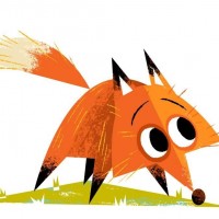 large ears, characteristic of a fox's appearance. The fox is depicted with a somewhat surprised or curious expression, looking to the side. It appears to be standing on grass, suggesting