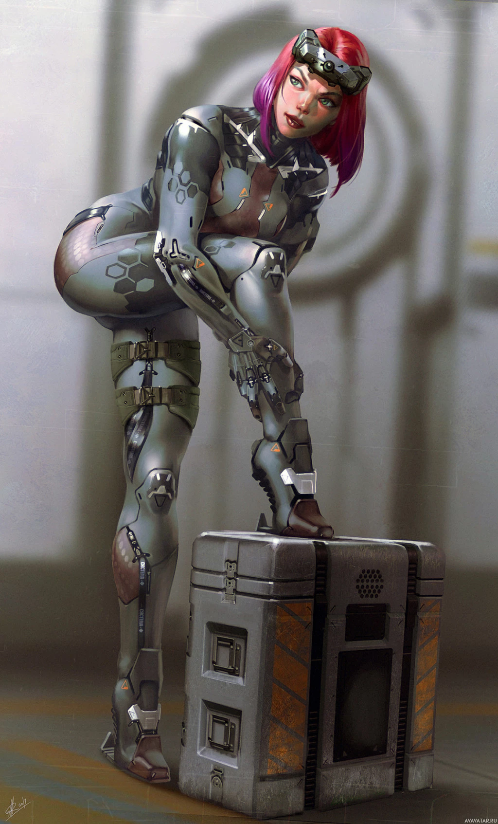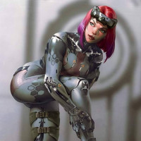a female character with red hair and futuristic attire. She appears to be a robotic or cybernetically enhanced individual, possibly from