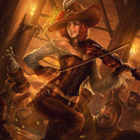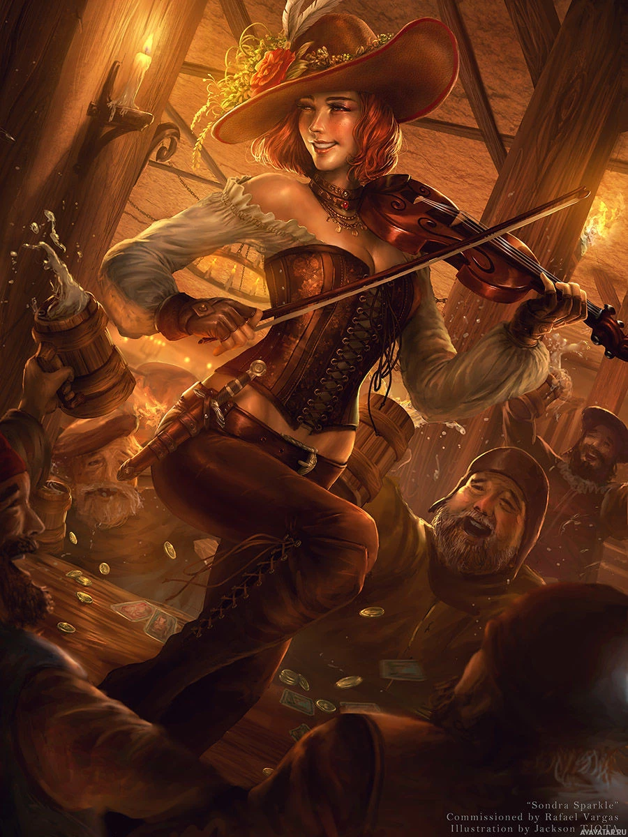 a pirate hat, possibly indicating that she is playing the role of a musician or performer in a pirate-themed setting. She is holding a violin and seems to be performing or entertaining others around her. The background suggests