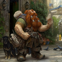 a fantasy scene with a dwarf standing in the foreground. He is dressed in what appears to be armor, and he has a long