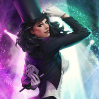 The image features a character dressed as Zatanna, a fictional superheroine from