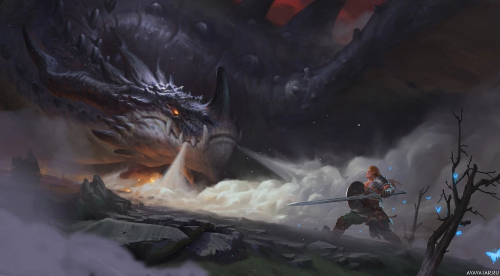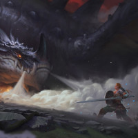a dramatic scene with dark clouds and lightning bolts, adding to the intensity of the encounter between the characters and the dragon. The overall style of the artwork is typical for fantasy-themed games or media, characterized by detailed characters and a dynamic environment.