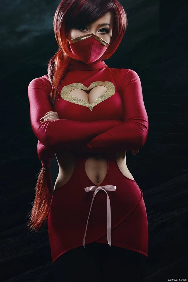a red costume with a mask that covers the eyes. They have a determined expression and are standing against
