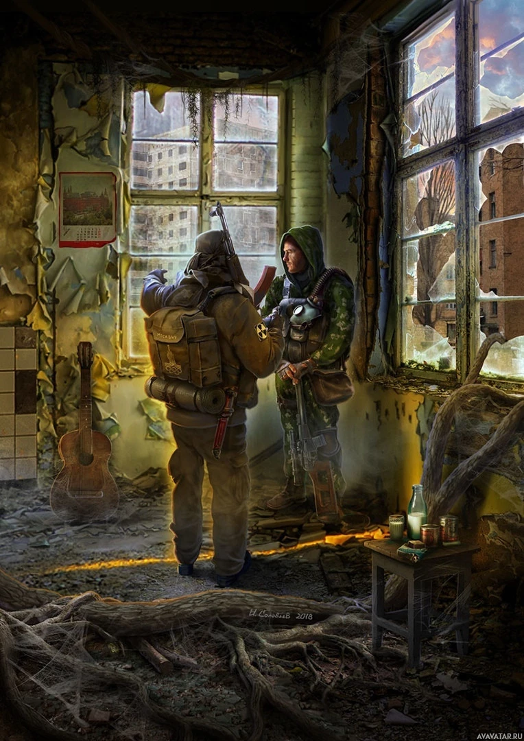 the post-apocalyptic setting typical of games like Stalker. The presence of weapons and the attire of the characters suggest they are partaking in gameplay elements related to exploration, combat, and survival within this