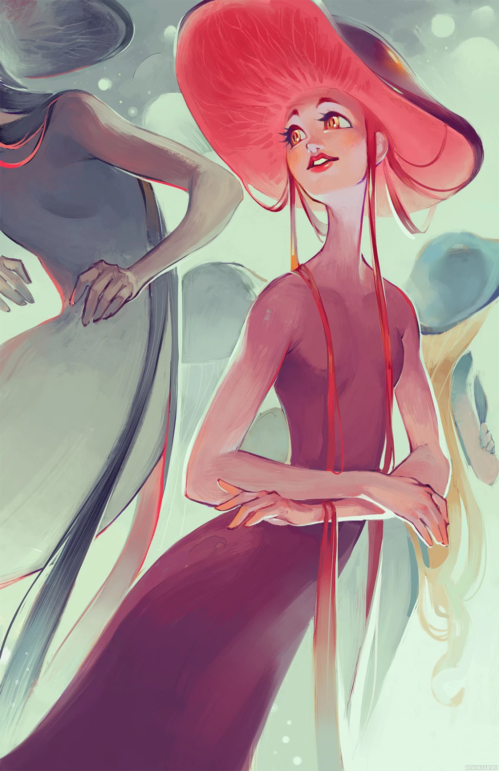 feathered wings and a halo, wearing a grey outfit that resembles a dress or tunic. The character on the right appears to be a girl with a playful expression, wearing a red hat that has two large feathers sticking up from it and