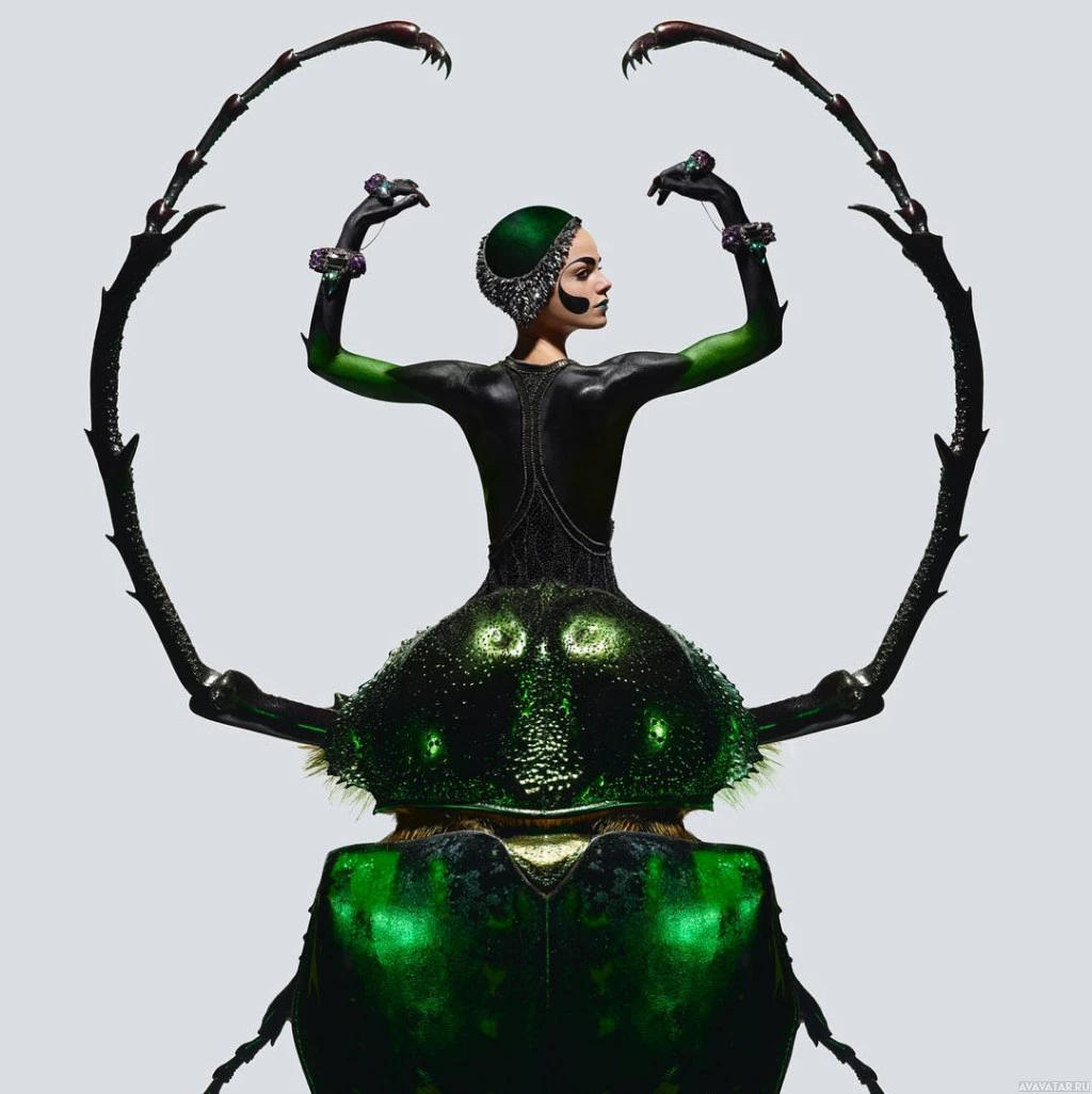 elongated body with legs and antennae on either side of their head, which is covered in the shiny black exoskeleton typical of beetles. The person is also wearing what appears to be a green and black outfit that matches the color scheme of some beetles. This character is likely part of a performance or