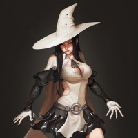 witch attire and a modern, stylish twist. The character's pose is confident and dynamic, with her hands out to the sides and one foot lifted slightly as if ready to step forward or cast a spell. The background is neutral, focusing attention on the character herself.