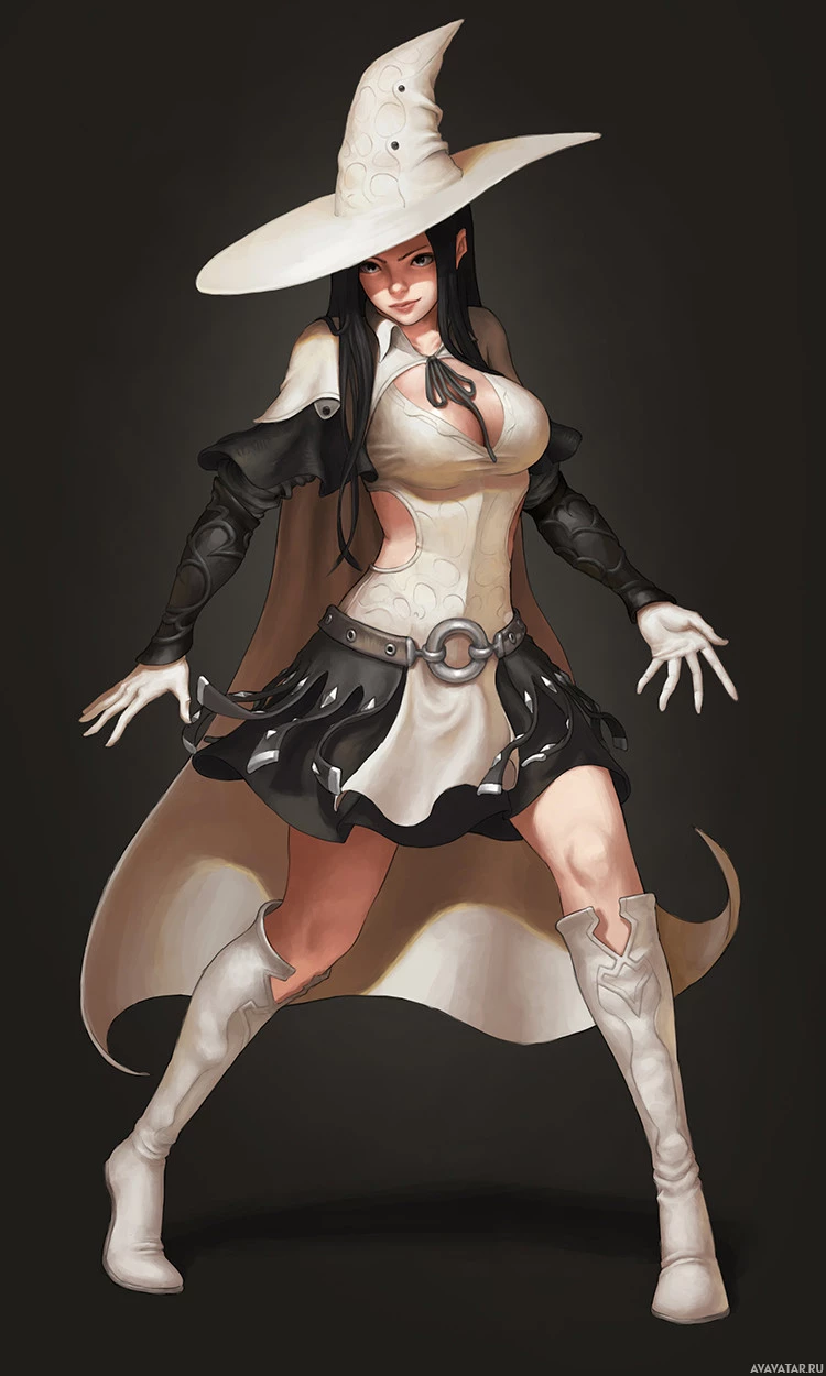 dark hair and is wearing a large brimmed witch hat, which suggests she might be a witch or involved in magical activities. Her outfit includes a light-colored dress with black elements, possibly indicating a mix of traditional