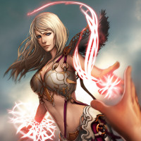 blonde hair and appears to be in motion, possibly casting a spell or performing some magical action with her hands, which are outstretched. The character is wearing armor-like attire that suggests she might be a warrior or a mage within the fantasy context of the image.