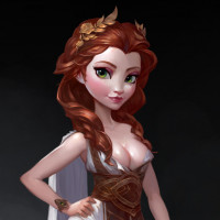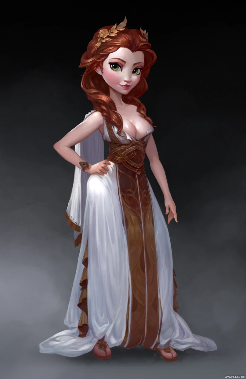 a white dress and a headpiece that could suggest she is dressed as a figure from mythology. Her hair is styled in red waves, and she has