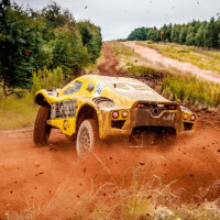 The image shows a car, specifically a rally car or off-road racing vehicle, in motion on