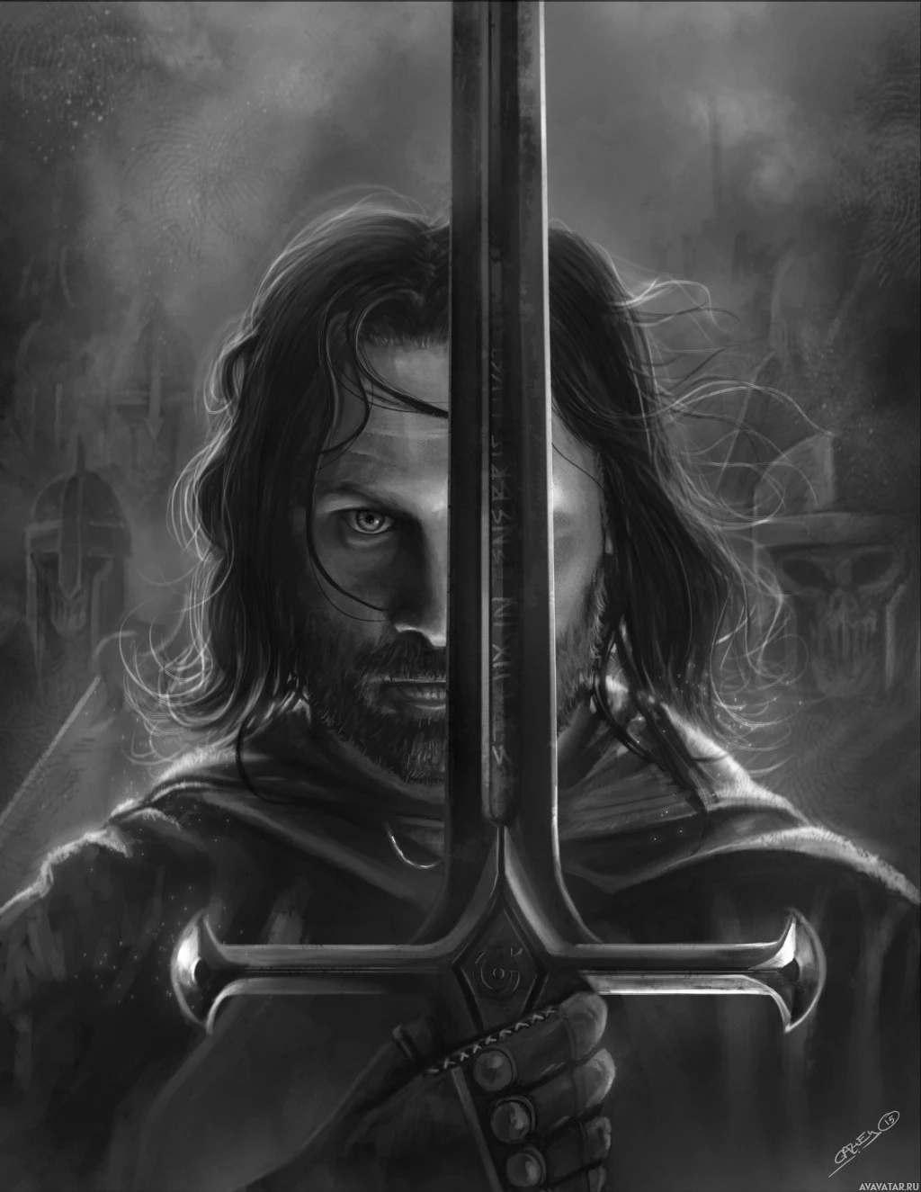 The image shows a character who appears to be portraying Aragorn from the Lord of the Rings universe, standing in what looks like the ruins of