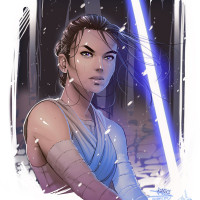 Last Jedi" where Rey has significant moments. The artwork captures the essence of Rey's character and her role in the Star Wars narrative.