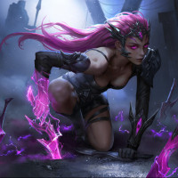 magical battle, given the streaks of purple and blue energy around her. Her pose and expression suggest determination or intensity. The setting looks like it could be an underground or enchanted place, with stone structures and