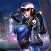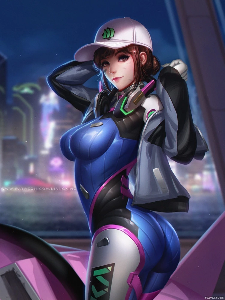 Изображение персонажа из видеоигры Overwatch, известной как D.Va. Она изображена в своем костюме героя и позирует с уверенным выражением, держа в руках то, что кажется шлемом ее мех-костюма. Фон предполагает городскую среду ночью, возможно, вдохновленную таким городом, как Токио.