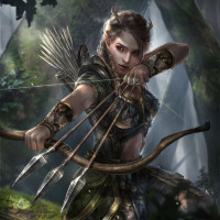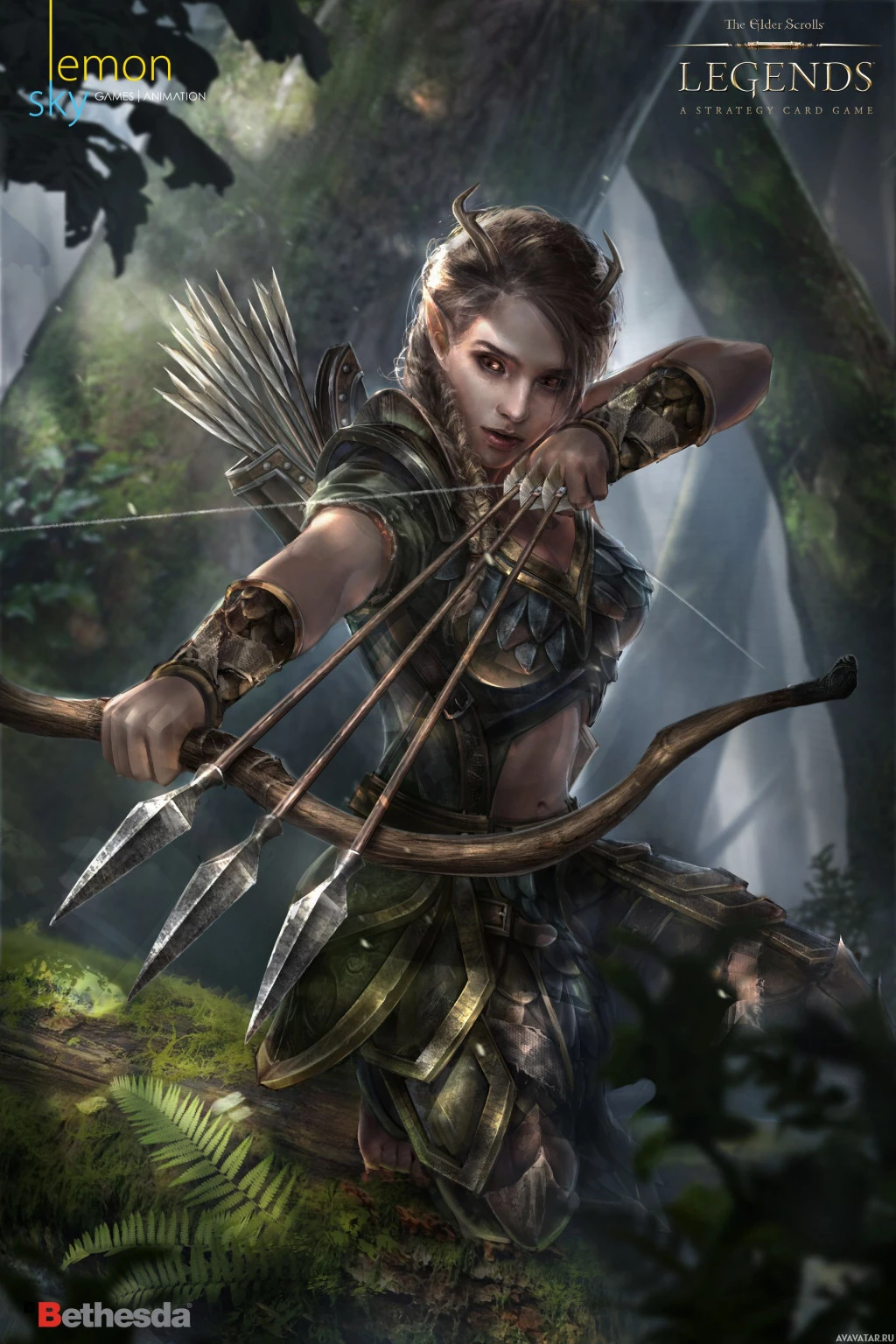 a fantasy scene with an elven archer. The character is portrayed as female and is aiming her bow, which has a quiver full of arrows attached to it. She is dressed in traditional elven attire, including