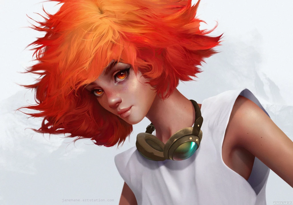 red hair and headphones. She has a distinctive look, possibly inspired by