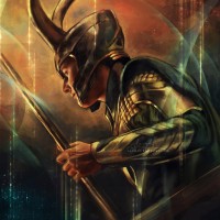 vibrant colors. The character is shown holding a scepter with his right hand and has a confident or commanding expression on his face. The background includes elements that suggest a mystical or otherworldly setting, which aligns with Loki's mythological origins and his role as a god of trickery in